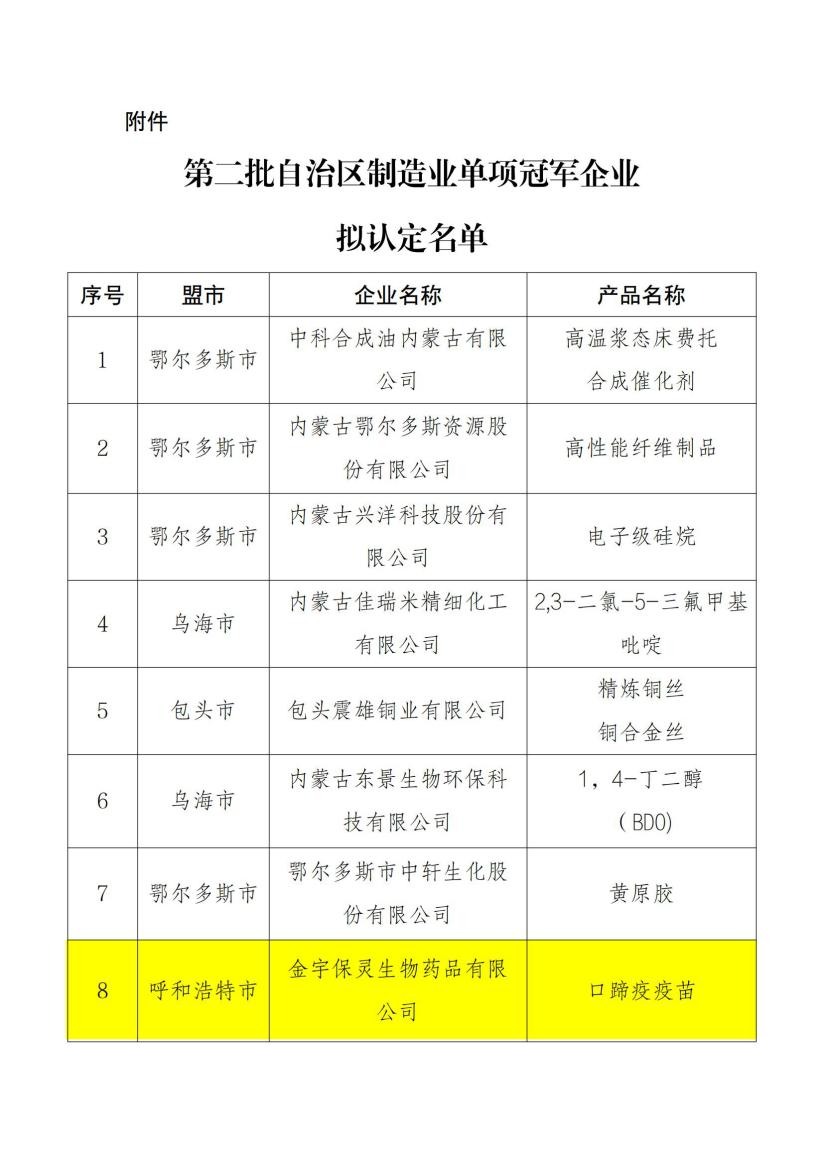 近日,依据工信厅对2024年自治区制造业单项冠军企业拟入选名单的公示,经开区的金宇保灵生物药品有限公司、内蒙古阜丰生物科技有限公司拟入选第二批自治区制造业单项冠军企业名单。