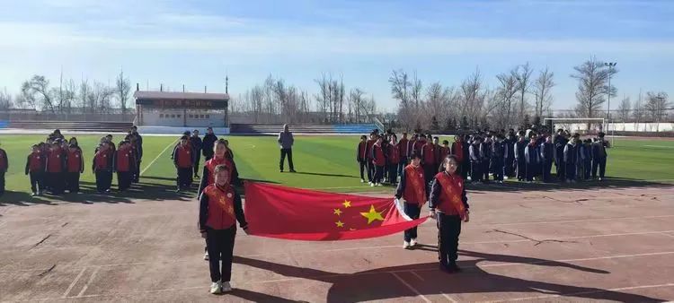 随着雄壮激昂的国歌声响起,鲜艳的五星红旗在晨风中徐徐升起,迎风招展。全体师生面向国旗行礼,庄严肃立,高唱国歌。